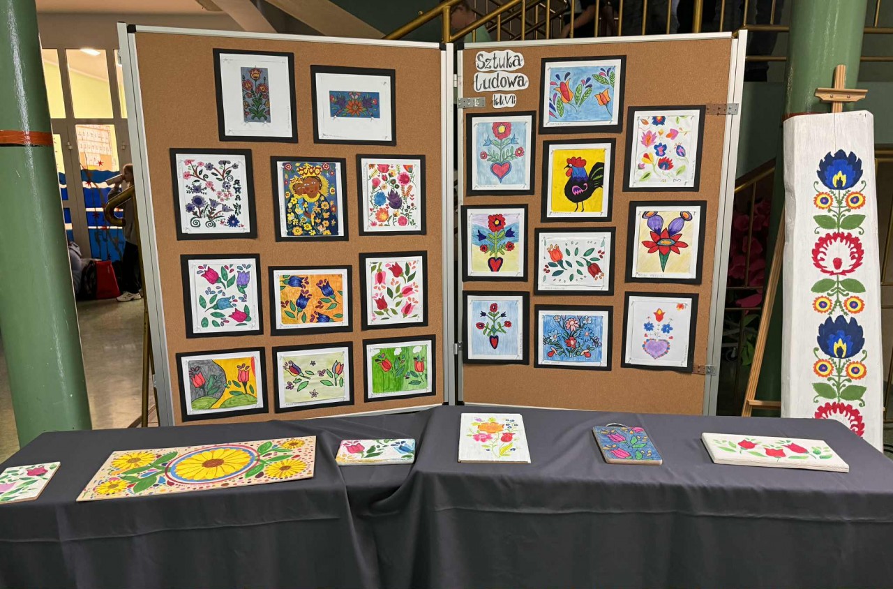 W szkolnym holu można obecnie oglądać wystawę prac plastycznych pt. „Sztuka ludowa”, przygotowaną przez uczniów klasy siódmej.