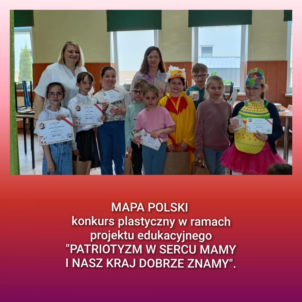 14 kwietnia został rozstrzygnięty konkurs plastyczny dla klas 0-3 pt. "MAPA POLSKI", realizowany w ramach szkolnego projektu edukacyjnego "PATRIOTYZM W SERCU MAMY I NASZ KRAJ DOBRZE ZNAMY".