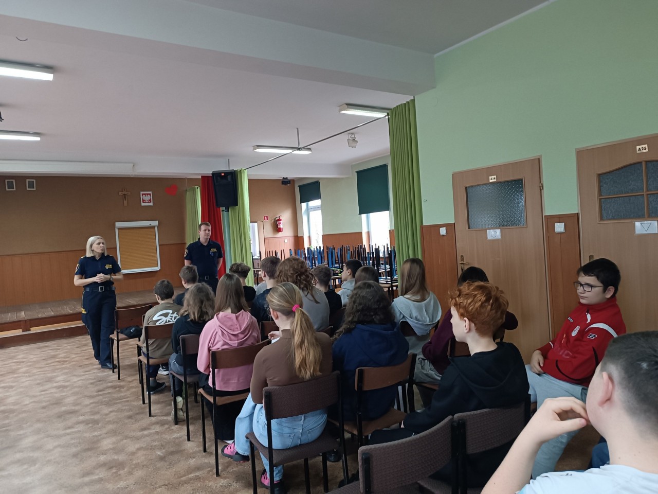 W ramach projektu "Odblaskowa szkoła" klasy ósme spotkały się z przedstawicielami straży miejskiej, którzy omówili zasady bezpiecznego poruszania się hulajnogami elektrycznymi.
